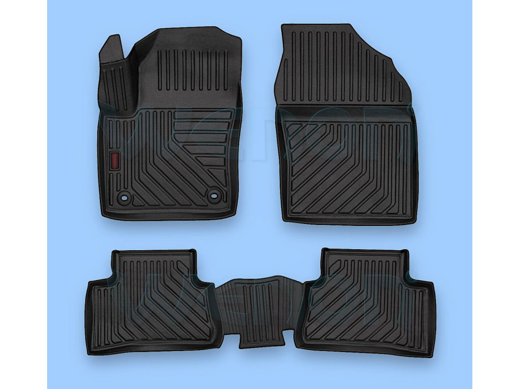 Tieto rohože sú vyrobené z kvalitného materiálu TPV (termoplastický elastomér), ktorý je pružný, odolný a bez zápachu. Zásadnou výhodou je už aplikovaná fixácia – rohož vodiča obsahuje presne osadené úchyty (kompatibilné s otočnými tŕňmi Toyota), takže ju stačí len vložiť a zaistiť. Vysoký 3D okraj (cca 3-4 cm) zadrží všetku špinu a vodu vo vnútri vaničky, čím chráni čalúnenie podlahy. Sú navrhnuté tak, aby sedeli do všetkých verzií po facelifte, vrátane populárnych hybridov 1.8 a 2.0.
